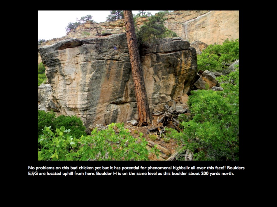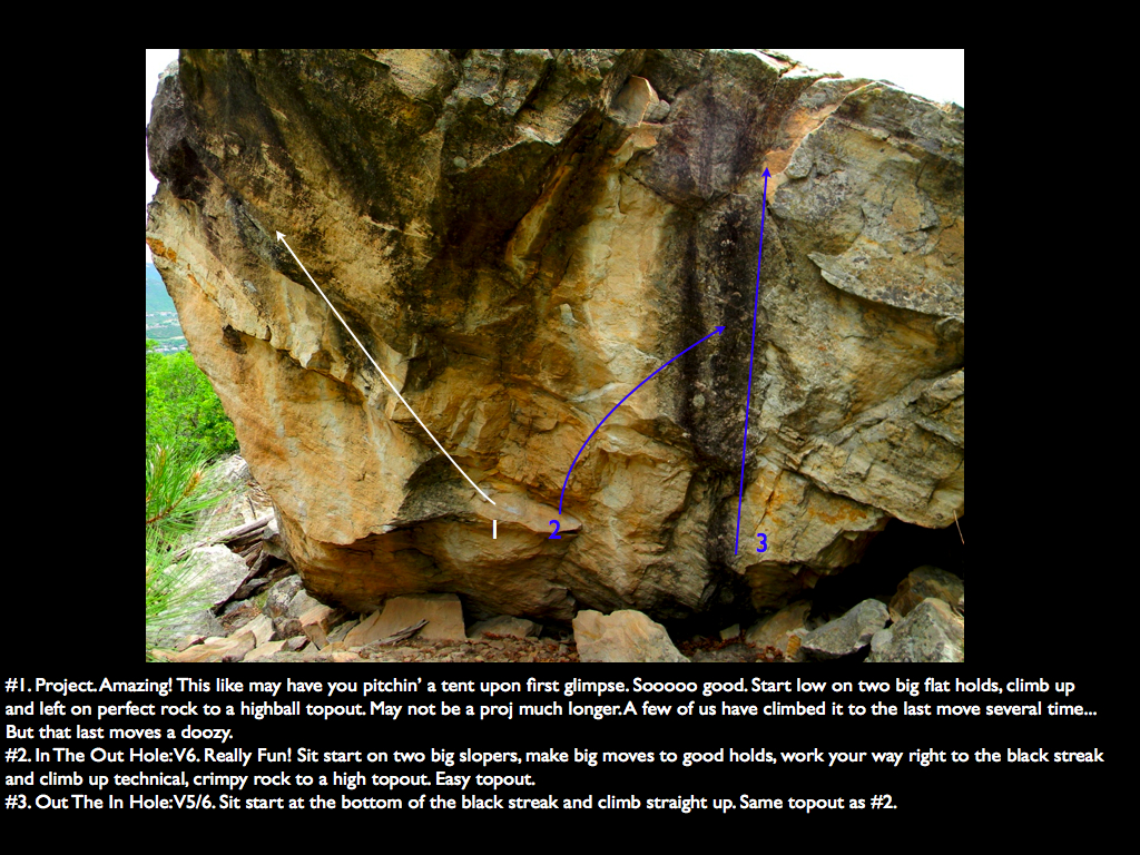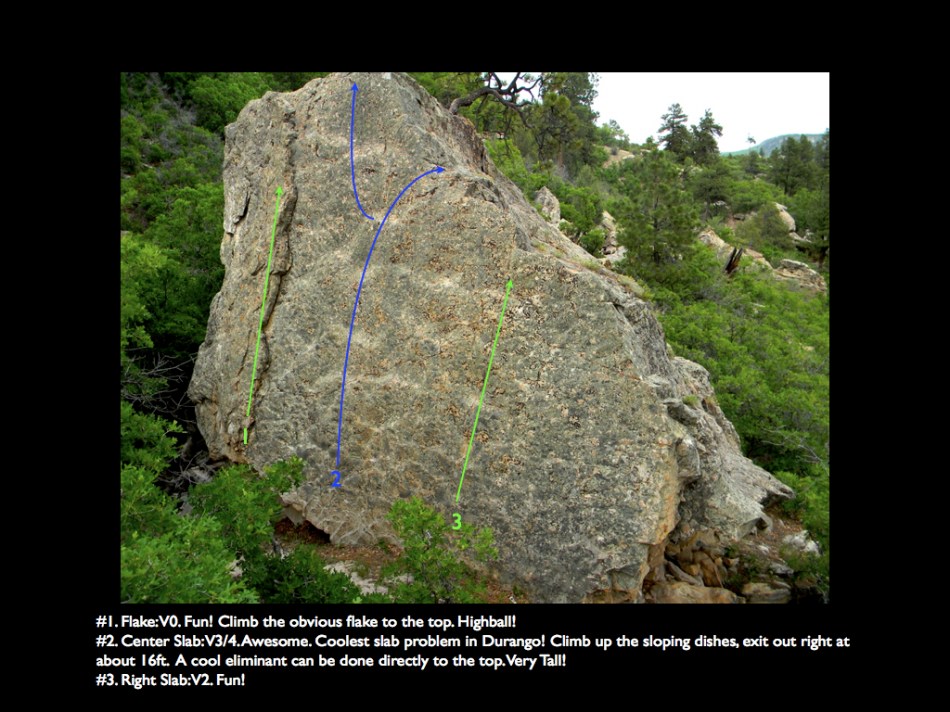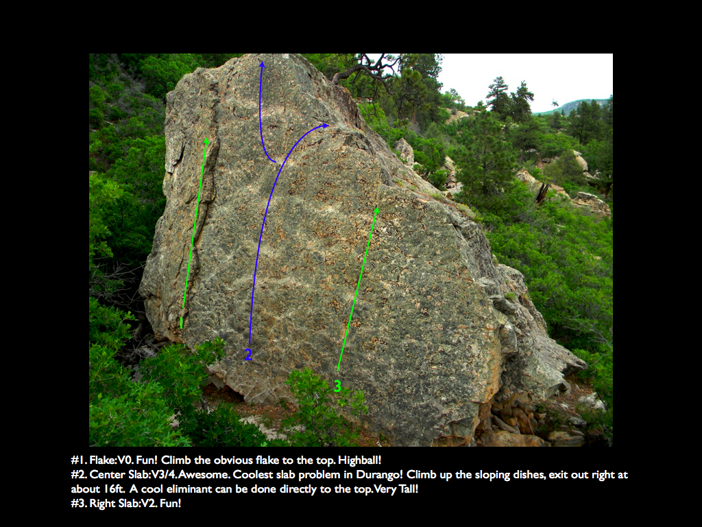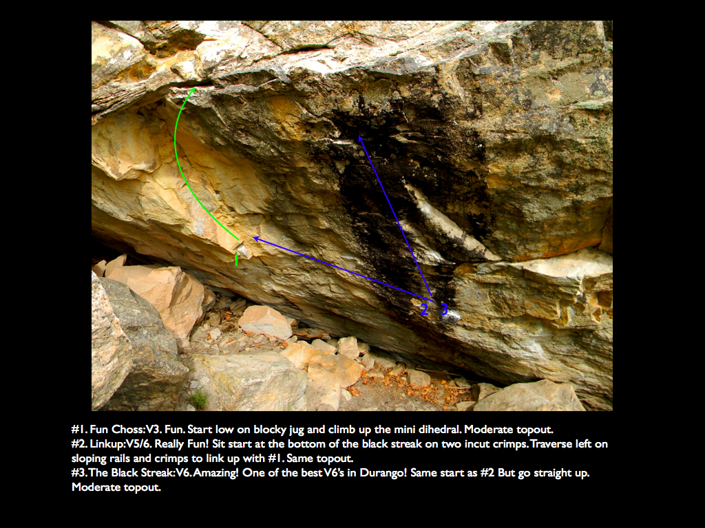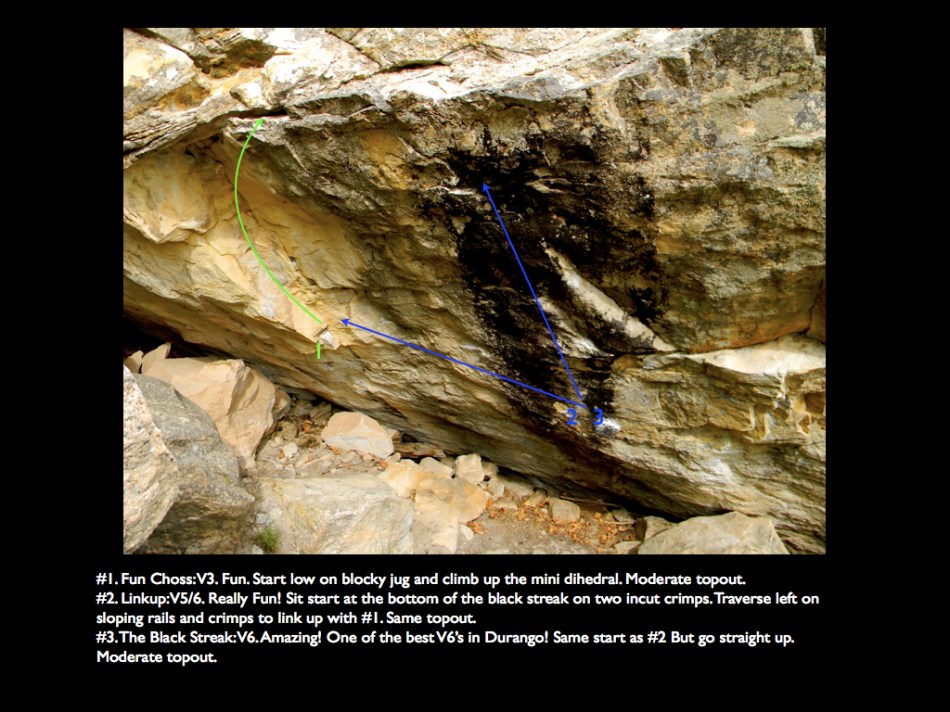 1. Most of the problems on Boulder C were put up by Jimmy Simons & Zach Lingerfelt back in 2004. Problem #2 on the North Face of Boulder C “In the Out Hole” was originally called “The N Word”. Problem #3 on the South Face of Boulder C “The Black Streak” was originally called “Blacktastic”. Both of these problems are defiantly some of the best V6s in Durango.