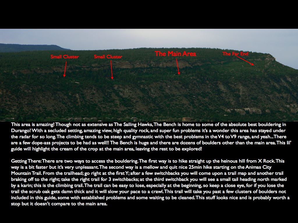 The Bench on Animas City Mountain is the East facing shelf above X-Rock it has a heinous approach but its quality will not disappoint. Over the years it has seen a rash of development from local climbers but it always seems to disappear back into obscurity. Hopefully now with the latest development being documented here it will remain on the radar and see the traffic it deserves.
